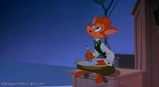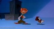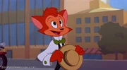 As soon as he arrives in Hollywood, Los Angeles, California, as the sun rises, he sings his arrival song and helps a penguin named Pudge (but neither introduces himself) load a block of ice onto a hand truck, and both dance until Danny gets onto a taxi, unaware that a girl cat named Sawyer is running to catch a ride. He then pays the driver (a horse) and puts up the rest of the title for "Gone with the Wind" and dances onto an imaginary globe. Next, although he gets caught by a guard, he manages to elude him by sneaking atop a cable car. Jumping and dancing on top of this car causes it to shake, and Sawyer, from earlier, spills her coffee. He also burns the feather on her hat as he hits the cable car's antenna. Getting off the car, he inadvertently knocks her into the fountain before skedaddling into the office building of Farley Wink.