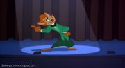As they are entering Mammoth Studios, Danny takes no notice to all of the miserable animals surrounding them. He then meets Pudge again on set and they finally introduce themselves. Much to Danny's dismay, his only line in the script is "Meow". He believes that since the film is a musical, they should sing and dance. He then practices saying the line imitating famous actors and draws the line at where he imitates Edward G. Robinson. On the set, he accidentally humiliates Darla when he tries turning his line into a singing part and dances. Darla reveals her true colors when she thrashes around and screams about how much she hates animals. She then calls on, or more likely, "summons" her giant butler, Max, who punishes Danny by asking him menacingly, "How does the kitty cat go?" After answering unsure and scared, Max plunges him into the floor which gives him a black eye.
